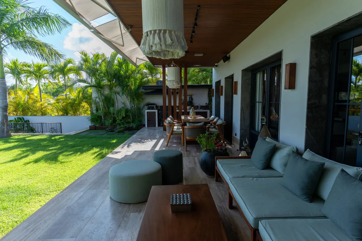En el exterior puedes encontrar una terraza completa techada con lonas para el sol, una cocina exterior con asador a gas y horno de piezza.
